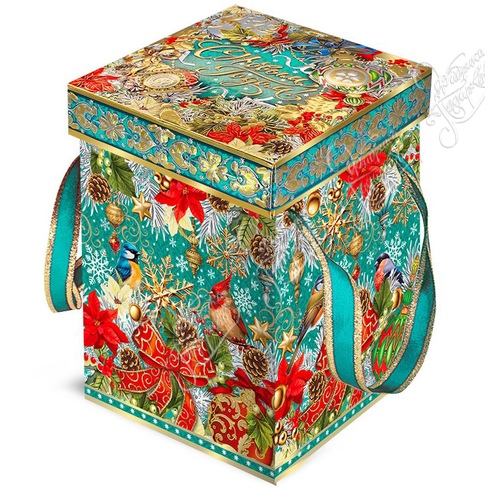 Крышка из футлярного картона украшена конгревными элементами, тиснение семицветным серебром и золотом, благодаря которому создается стереоскопический эффект